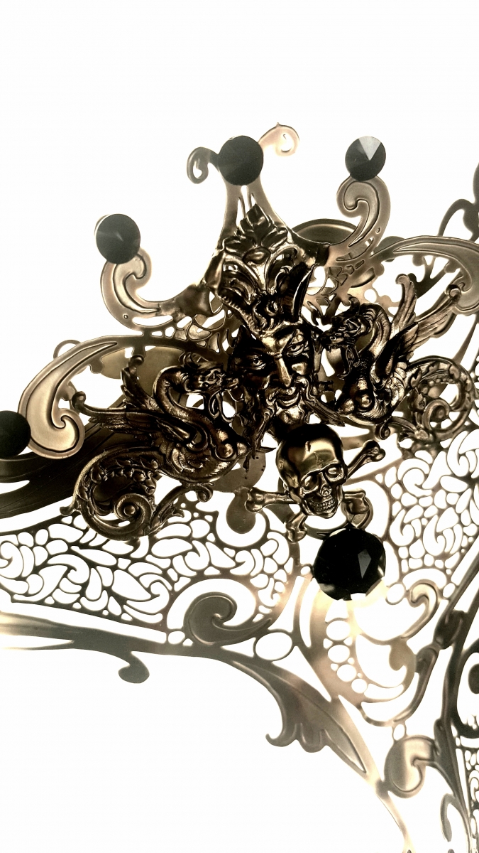 Handgemachte Metallmaske, Kupferlegierung und Messingzubehör. Produkt in Bronzefarbe bemalt und mit Cabochon und Swarovski-Kristall verziert (Bestandteile von Daniel Swarovski & Co.). Einzelstück von Hand gefertigt. Auf Anfrage können wir Anpassungen in Gold, Silber oder brüniertem Finish und Varianten von farbigen Steinen vornehmen. Produziert in Venedig, Italien.